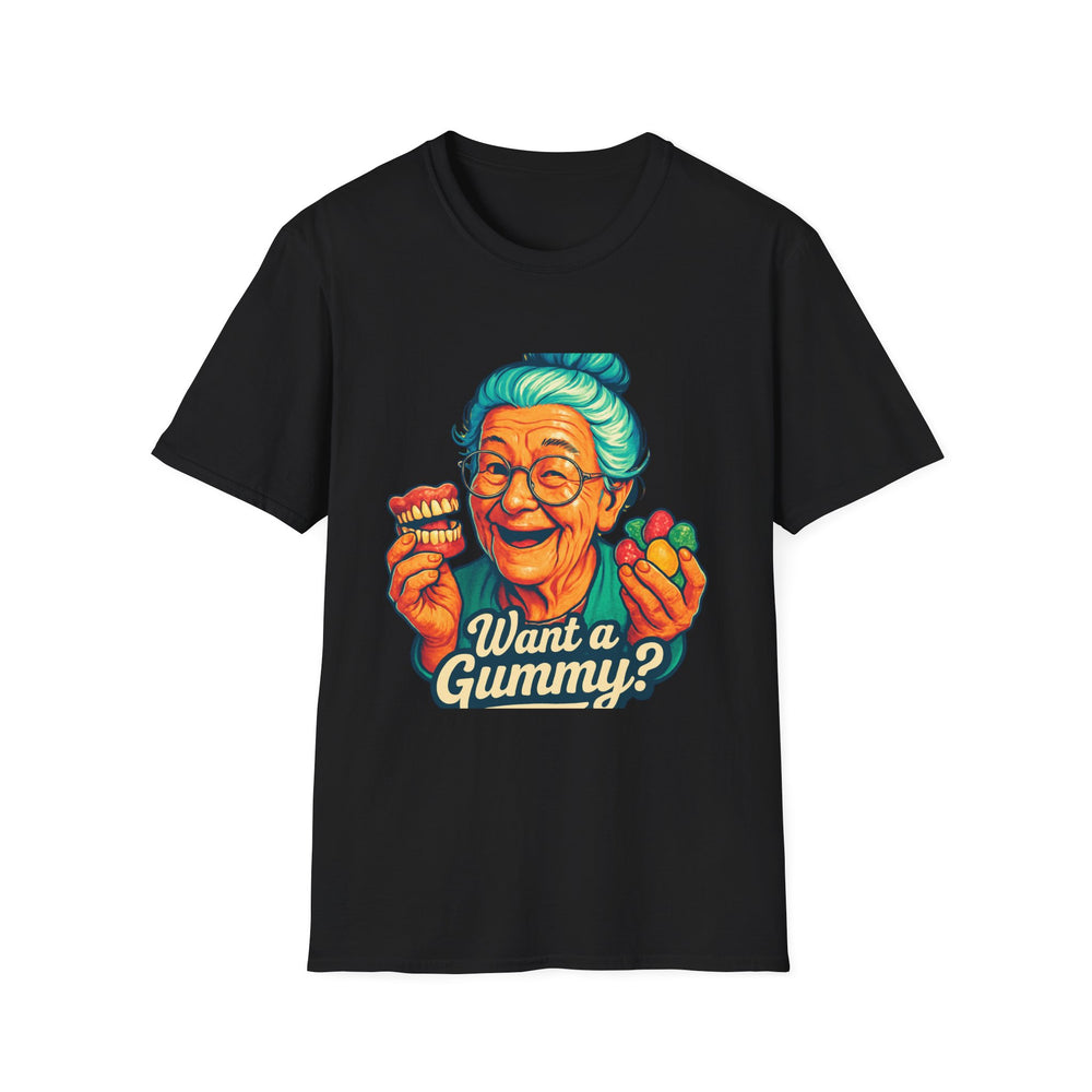 Dark Humor Adult T-Shirt — Grandma Asking "Want a Gummy?"